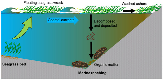 The national seagrass resource surveys conducted from 2015 to 2020 have revealed the presence of only one eelgrass bed in Tangshan’s coastal waters, which happens to be the largest in China. Strong evidence suggests that the floating seagrass consumed by A. japonicus in the marine ranching originates exclusively from this particular bed [34,35]. Due to its high primary productivity [53], seagrass meadows continuously shed leaves that eventually float to the sea surface [54] and are subsequently transported away by winds and currents [11,55]. These floating seagrass wracks travel across various habitats until they reach beaches or settle on the seafloor. The coastal currents play a crucial role in connecting the eelgrass bed with Xiangyun Bay’s marine ranching activities, facilitating significant transport of seagrass wrack. Eelgrass wrack production reaches its peak during late summer or early autumn in temperate northern China, allowing for a rough estimation of annual wrack production through comparison of aboveground biomass differences between seasons. With an area spanning 3217.32 ha, it is estimated that approximately 3975 dry-weight tons of wrack are generated annually by this seagrass bed based on aboveground biomass measurements of 240.67 ± 90.53 g m−2 dw in July and 117.12 ± 65.27 g m−2 dw in September [34]. A portion of this wrack decomposes and enriches sediment organic matter, which is crucial for A. japonicus’ diet requirements. The sediment within Xiangyun Bay’s marine ranching area contains a substantial amount of eelgrass debris (personal observation). Additionally, significant amounts of washed-ashore seagrass wrack have been reported along shorelines northeastward from the bed according to previous studies (Figure 4).
