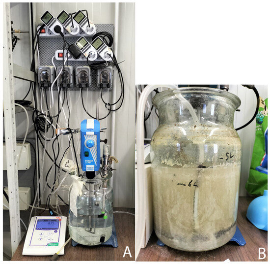 (A) Setup of the selection reactor: glass reactor with a stirrer, DO probe, pH meter, peristaltic pumps, aeration, and timed sockets; (B) Biomass inside the selection reactor during the famine phase.