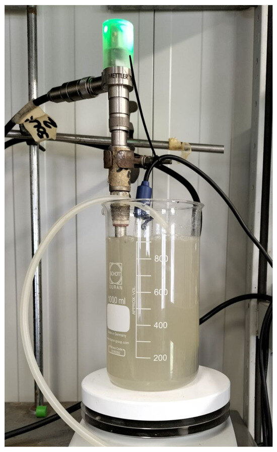 At the end of the third scenario, batch accumulation tests were conducted with biomass sampled for the SBR reactor. The test, conducted in triplicate, took place on three consecutive days to minimize the variability of the selected biomass. All batch tests were performed with multiple and instantaneous spikes of the substrate to obtain a feast phase longer than in SBR to determine the maximum specific PHA storage rates, PHA storage yield, and the maximum polymer content achievable in the biomass. The biomass was withdrawn from the SBR at the end of the famine phase and placed in a smaller reactor (working volume of 600 mL, temperature and pH monitored but not controlled), as shown in Figure 2. The biomass was fed with the same mixture of VFA as in the SBR, but at a higher concentration to have the same concentration in the reactor (300 mgCODL−1) with a smaller volume of feeding solution. The spiking was manually conducted following the DO trend (continuously monitored): the first spike was performed at the beginning of the test, and the operation was then repeated at each DO rising over 5 mgL−1 until the spike caused no further change in DO level [16].