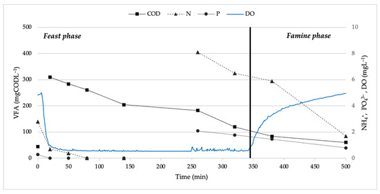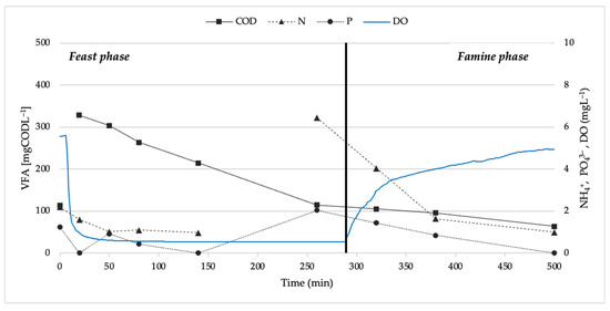 As illustrated in Figure 4, the VFA reduction follows a similar trend as in the previous scenario, with a constant reduction during the feast phase and steady concentration during the first 100 min of the famine phase. Even in this case, the DO starts to increase when the COD is about 100 mgL−1. In contrast to the previous scenario, the nutrient concentration decreases faster, indicating a higher replication of bacteria, probably due to a higher biomass concentration.