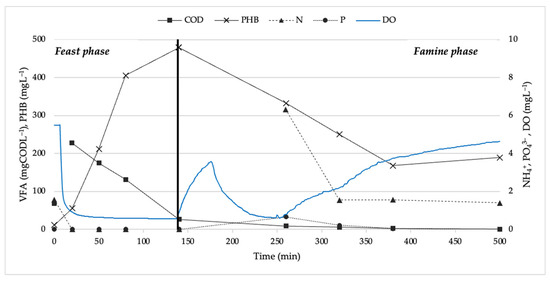 For the three identified scenarios, COD, NH4+, and PO43− at the end of the famine phase were analyzed during the respective weeks. In addition, DO was continuously monitored. For the third scenario, PHB analysis was also performed. Finally, the complete characterization of the ninth cycle, i.e., the first one following the complete biomass change (SRT = 4 d), was performed. During the cycle analysis, COD, NH4+, and PO43− were monitored at defined intervals, as were TSS and VSS, both of the reactor and supernatants.