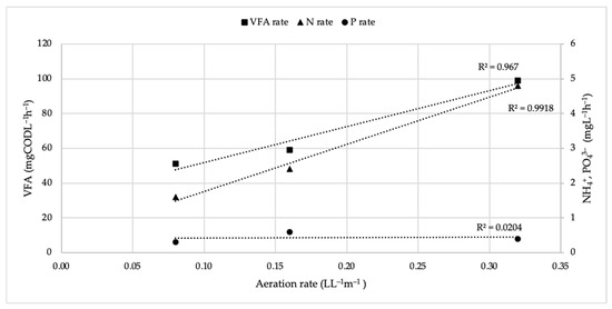 Although the number of observations was limited, the results identified prompted the investigation of the potential correlation between airflow and VFA, NH4+, and PO43− uptake rates, as illustrated in Figure 6.