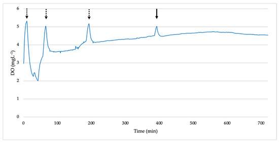 The dissolved oxygen (DO) was measured continuously during each cycle using a DO probe (Mettler Toledo, InPro6000, Optical O2 Sensors, Milan, Italy). An automatic control and data acquisition system (LabView, National Instruments Corporation, Austin, TX, USA) gathered and processed the probe’s signals [28]. The DO concentration declined to a low and nearly constant value throughout feeding; the subsequent increase in DO concentration indicated that the substrate had been depleted. This point also marked the end of the feast phase and the beginning of the famine phase, and it was used to compute the feast-famine ratio for each cycle [29,30].