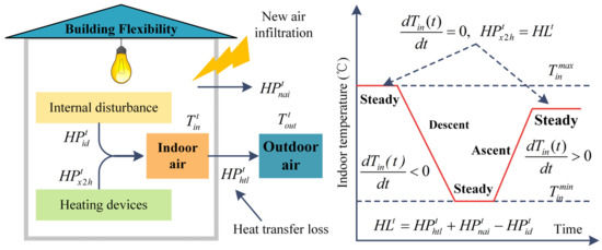 According to Figure 2, the heat load (HLt) is the difference between the heat power contributed by internal disturbance (e.g., heat energy from household appliances and heat dissipation via server operation) and the sum of that contributed by heat transfer and cold air infiltration. When the sum of the heat power of the heating devices () is equal to the heat load, the derivative is 0 and the indoor temperature of buildings remains constant (namely the steady period). When is greater than the heat load, the derivative exceeds 0 and the indoor temperature of buildings increases (namely the ascent period), realizing the storage of heat energy in buildings. When is less than the heat load, the derivative is less than 0 and the indoor temperature decreases (namely the descent period), releasing the heat energy stored in buildings.