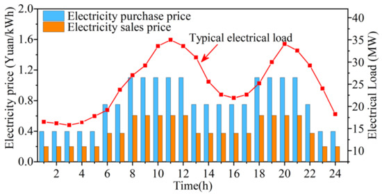 Moreover, the typical hourly wind velocities and outdoor ambient temperatures of the industrial park are shown in Figure 3; the corresponding typical hourly electrical loads and sale/purchase electricity prices are displayed in Figure 4.