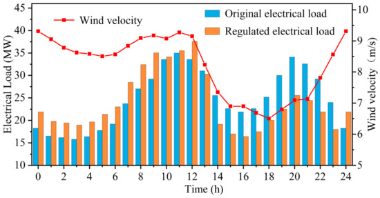 Figure 5 shows that the wind velocity in the park is larger during the period 0:00–12:00. After 12:00, the wind velocity shows a downward trend. After 18:00, the wind velocity in the park shows an upward trend. On the whole, the flexible electrical load can consume renewable energy as much as possible by transferring the load to the high wind velocity period to reduce the total operating cost. Therefore, it presents the characteristics of turning in the high wind velocity period and turning out in the low wind velocity period. Accordingly, in the 0:00–12:00 period, the regulated electrical load is higher than the original electrical load; in the 12:00–23:00 period, the regulated electrical load is lower than the original electrical load.