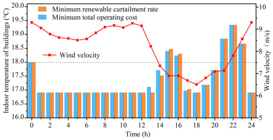 It is noteworthy that indoor temperatures show a similar trend at a minimum total operating cost and a minimum renewable curtailment rate, with only a small difference at 13:00–17:00; Notably, when the output of the wind turbine is minimal, the indoor temperature under targeting a minimum renewable curtailment rate is greater than that under targeting the minimum total operating cost.