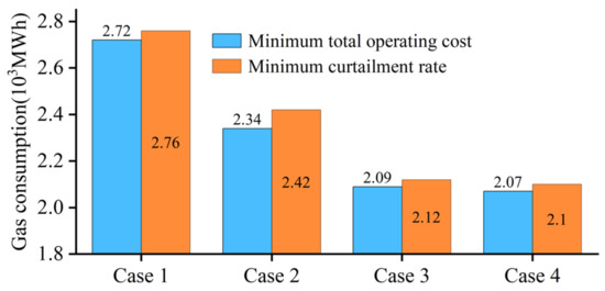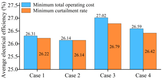 According to Figure 7, when the operation optimization targets the minimum total cost, the average electrical efficiency of the gas-fired CHP unit in the original HRIES is 26.31%. If flexible electrical load regulation is considered in the operation optimization of HRIES (case 2), the average electrical efficiency will be reduced to 26.14%. Under the same load, this case needs to consume more natural gas. Nevertheless, the flexible electrical load regulation leads to a reduction in the renewable curtailment rate, enabling a portion of the electrical load to be supplied by wind turbines, resulting in a decrease in the total consumption of natural gas from 2.72 × 103 MWh in Case 1 to 2.34 × 103 MWh (Figure 8). The data again proves that flexible electrical load regulation reduces the total operating cost by increasing renewable energy consumption.