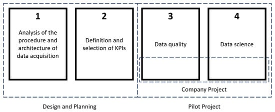 The first two phases establish the Design and Planning stage. This stage involves a comprehensive analysis of production conditions, the tools currently in use, and the necessary information collection. During the initial phase of outlining the architecture of the data acquisition process, it is worth noting that the integration of Industry 4.0 technologies may significantly enhance the ability to collect and store data. This advancement could further facilitate the identification and definition of potential KPIs aligned with the company’s strategic objectives, setting a strong foundation for data-driven decision-making. During the second stage, KPIs that are necessary for monitoring and managing processes are selected. The subsequent step involves implementing the data collection structure and KPIs that have been previously determined.