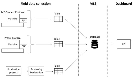 MESs are widely used technologies, particularly in large enterprises, due to their high productivity and minimal product variations. An MES operates with high levels of automation and integrates seamlessly, allowing for continuous monitoring through data collection and KPI calculation [19]. This tool is a statistical data processing system that provides comprehensive insights into production performance, including material input, consumable utilisation, product flow, and faults [20]. Thanks to these data and the Industry 4.0 manufacturing paradigm, Kuys Blair et al. state that it is possible to create more durable and sustainable products [21].