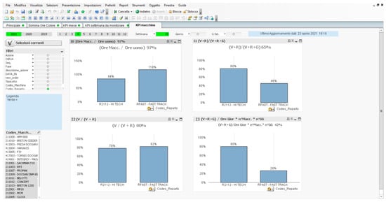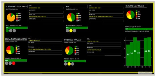 The machine dashboard is displayed on each machine, providing real-time monitoring of its performance. It shows the same information as the department dashboard but only for the specific machine. This allows the operator to receive direct feedback on the operation efficiency. In addition to the machine dashboard, the operator also has access to the MES interface. This facilitates machining operations by displaying technical documents, set-up diagrams, and quality checks. Similar dashboards to those shown in Figure 5 and Figure 6 were created for the other KPIs, I0, I2, and I3, monitored by the departmental manager, technical department, and sales and planning department.