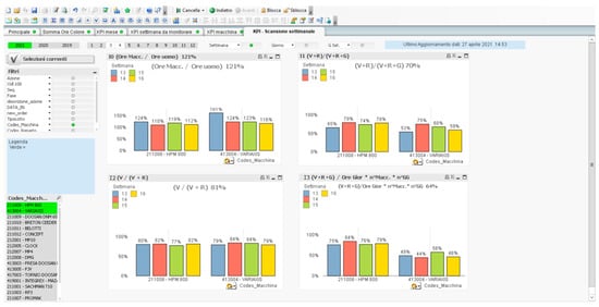 Figure 7 shows the indicators for two different departments during a specific week. The left and top sections contain filters that allow for customisation of the display based on each request. Figure 8 demonstrates the variation of all indicators in two machines during the selected weeks: