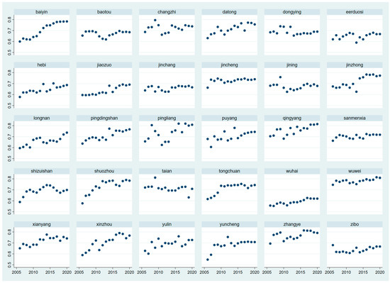 In the development process of growth-type and mature resource-type cities, the contradiction between resource development intensity and ecological environmental protection is prominent [35], and the problems left by resource depletion in recession-type and regeneration-type resource cities are serious and face the urgent need for industrial structure transformation and optimization development. Therefore, this paper selects the proportion of the tertiary industry as the control variable of industrial structure transformation. In the process of transformation and development, the science and technology empowering green mining can effectively alleviate the contradiction between resource development and ecological environmental protection. At the same time, relying on science and technology for transformation and development is conducive to industrial upgrading and the optimization of resource-depleted cities and improving the quality of development. Therefore, this paper chooses the proportion of green inventions in the total number of inventions applied annually as the control variable of science and technology transformation and development in resource-based cities. In the process of resource-based city development, the government’s attention to environmental protection is of great significance for sustainable development. Therefore, this paper chooses the frequency of environmental protection words as the total number of words in the government work report as the control variable for environmental protection policy.
