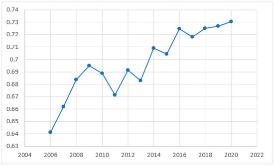 In 2013, China issued a sustainable development plan for resource-based cities. This paper takes Tc as the difference variable of ecological safety level to measure the change level of ecological safety of resource-based cities in the Yellow River Basin and introduces the time dummy variable dt, which is set as dt = 0 from 2006 to 2012 before the policy was issued and dt = 1 from 2013 to 2020 after the policy was issued. A double difference model is expressed by Equation (13)