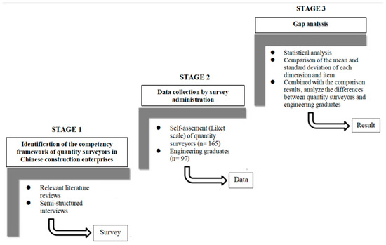 Stage 1: Identification of competency framework of quantity surveyors in Chinese construction enterprises. This stage aimed to identify a set of personal competencies for measurement in the research, facilitating quantitative analysis of the main gaps between engineering graduates and quantity surveyors. Initially, through a detailed literature review and drawing upon the competency frameworks of institutions such as the Royal Institution of Chartered Surveyors (RICS), the Pacific Association of Quantity Surveyors (PAQS), the Association for Advancement of Cost Engineering (AACE), and the China Cost Engineering Association (CCEA), a comprehensive dimension and indicator scope for quantity surveyors’ competencies were derived. Simultaneously, in alignment with the research objectives, the competency framework and indicator range for quantity surveyors in construction enterprises were determined based on the life cycle stage of construction projects, corresponding job responsibilities, and the specific behaviors or characteristics expected from quantity surveyors. This laid the theoretical foundation for exploring the competencies of quantity surveyors in Chinese construction enterprises [76]. To further enhance the scientific and rational competency framework and indicators for quantity surveyors in construction enterprises, considering the unique characteristics of China’s construction industry, 10 quantity surveyors with over ten years of experience in cost management were selected from various Chinese construction enterprises for semi-structured personal interviews. These interviews aimed to refine the competency indicators obtained from the literature review and introduce new competencies and metrics identified by experienced professionals. The interviewed quantity surveyors represented diverse professional backgrounds, including housing construction, road engineering, bridge engineering, prefabricated construction, and so on, ensuring the independence and heterogeneity of the sample data. These interviews were conducted individually with each quantity surveyor; they were asked to select competency indicators for quantity surveyors in construction enterprises based on their experience and respond to open-ended questions [77]. Through a synthesis of the literature review and expert interviews, 27 competency indicators were proposed as valid for analyzing the personal competencies of quantity surveyors in construction enterprises and engineering graduates.