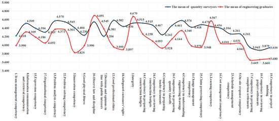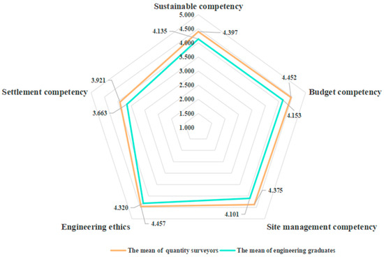 Several shared characteristics in the outcomes can be noted for quantity surveyors and engineering graduates. In both samples, the highest mean scores are for engineering ethics, with 4.457 and 4.320, respectively, followed by budget competency, with 4.452 and 4.153, respectively. Additionally, the lowest scores are for site management competency and settlement competency, with 4.375 and 4.101, respectively, and 3.921 and 3.663, respectively. From these results, it can be derived that both quantity surveyors and engineering graduates demonstrate a strong sense of responsibility and adherence to laws and disciplines. However, both groups tend to allocate less emphasis to site management competency and settlement competency (in particular, the score of settlement competency in the quantity surveyor sample is significantly lower than the score of the other four dimensions), believing that quantity surveyors do not need to participate in project management and that the completion settlement of construction projects is only the general finishing work, instead of recognizing the role of these activities in adding value to the project [100].