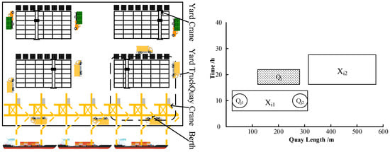 The competitiveness of a port is significantly influenced by the effective management of the berth allocation problem (BAP) and the quay crane scheduling problem (QCSP), which are fundamental components of container terminal production operations. Hence, numerous domestic and international scholars have sequentially investigated scheduling issues concerning independent and collaborative scenarios for container terminal berths and quay cranes, considering both deterministic and uncertain environments. Bierwirth and Meisel [,] put the spotlight on the container terminal frontier operations, categorizing them according to different attributes, such as spatial layout, vessel arrival time, and operation time.