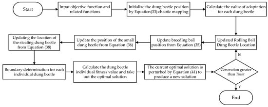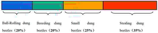 The dung beetle optimizer algorithm is a novel population intelligence optimization algorithm proposed by Xue et al. [] in 2023, and which is inspired by the social behaviors of dung beetle populations, i.e., dung beetles’ ball-rolling, dancing, foraging, breeding, and stealing behaviors. Figure 2 shows the proportion of population species distribution in the DBO algorithm.