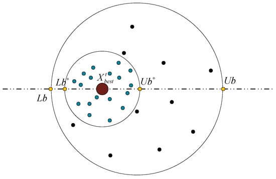 In Equations (26) and (27), represents the current localized best position and and represent the upper and lower boundaries of the spawning area, respectively. , and is the maximum number of iterations.