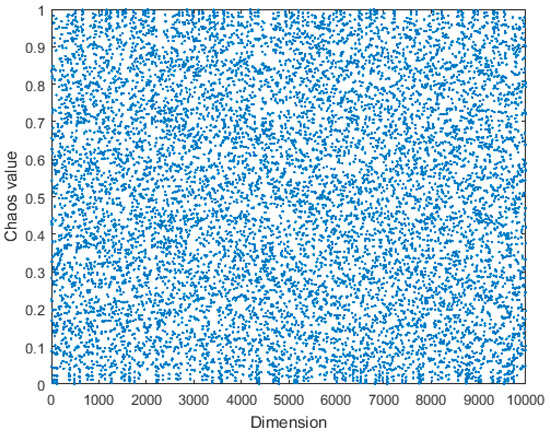 Chaos mapping, an amalgamation of deterministic and stochastic approaches, is distinguished by its inherent characteristics of randomness and non-periodicity. Bernoulli mapping, a subtype of chaotic mapping, is frequently employed for the generation of chaotic sequences due to its nonlinear, ergodic, and random characteristics. In the realm of optimization, it replaces random numbers for population initialization, significantly influencing the algorithmic process. Studies, such as the work by Saito et al. [], have demonstrated that Bernoulli mapping outperforms random numbers in achieving optimal results during the optimization searches. The research also underscores the suitability of Bernoulli mapping for chaotic population initialization, showcasing its traversal uniformity and convergence speed. Through well-designed experiments, Saito et al. [] provided evidence supporting the use of Bernoulli mapping for the generation of initial populations in optimization algorithms. The distribution of chaotic sequences generated by Bernoulli mapping is depicted in Figure 4, further illustrating its effectiveness in this context.
