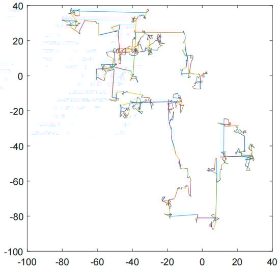 Figure 5 shows the simulation of a 2D planar Lévy flight in Matlab using Mantegna’s method; from the simulation, the paths of the graphs are indeed in line with the characteristics of Lévy flights in terms of their lengths and shorter lengths, and Mantegna’s method of generating stochastic steps that obey a Lévy distribution with a normal distribution is reliable.