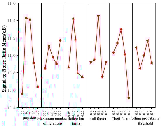 In this study, the Taguchi method is used to determine the algorithm parameters, and the signal-to-noise ratio (SNR) is utilized to evaluate the algorithm’s performance under different combinations of parameters. During the implementation of the algorithm, parameters such as popsize, maximum number of iterations (), deflection coefficient (), roll coefficient (), steal coefficient (), and roll probability threshold () are required to be set.
