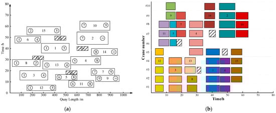 Dispatch solution. (a) Gantt chart of vessel berthing operations; (b) Gantt chart for quay crane operations and maintenance.