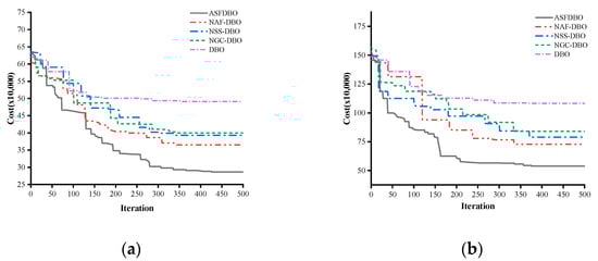 Objective function convergence curves for ASFDBO, NAF-DBO, NSS–AGA, NGC-DBO and DBO. (a) Scale of 10; (b) scale of 15.