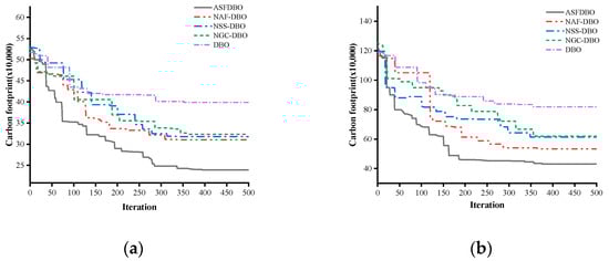 Carbon footprint convergence curves for ASFDBO, NAF-DBO, NSS–AGA, NGC-DBO and DBO. (a) Scale of 10; (b) scale of 15.