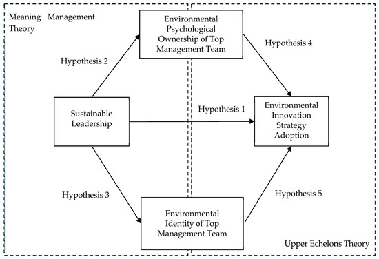 Third, since the manufacturing processes of technological products cause a large amount of environmental pollution and resource consumption, environmental strategies are very important for the technological industry to alleviate environmental pollution. However, there are still many black boxes on how to enable companies to implement environmental innovation strategies [9,10]. Therefore, this research draws on upper echelon theory [11] and meaning management theory [12] to open this black box. Meaning management theory [12] believes that organizational values can be transmitted through the leadership process, and the leadership process can also change followers’ values to meet organizational expectations. Upper echelons theory [11] believes that a supervisor’s characteristics (such as age) or personal values (such as attitude toward the environment) can affect the company’s strategy adoption. Indeed, a chief executive officer’s adoption of sustainable leadership should change the attitude of a company’s senior management team towards the environment. In particular, a company’s top management team controls most of the company’s resources invested in strategic activities [2], so the environmental attitudes of these top management teams should influence the company’s adoption of environmental innovation strategies.