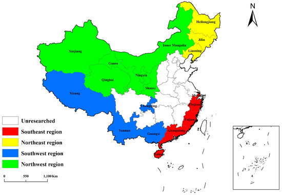 There are 18 provinces along the Belt and Road in China. Nevertheless, owing to the absence of input–output data for Xizang in the statistical yearbook, this study focuses on studying innovation factor allocation efficiency in the remaining 17 provinces (municipalities and autonomous regions) along the Belt and Road in China. The sample data span from 2012 to 2021. To better investigate the regional differences in innovation factor allocation efficiency along the Belt and Road, this study categorizes the regions in China into four distinct regions. Among them, Shanghai, Zhejiang, Fujian, Guangdong, and Hainan are classified as part of the southeast region. Heilongjiang, Jilin, and Liaoning are classified as part of the northeast region. Chongqing, Yunnan, Guangxi, and Xizang are classified as part of the southwest region. Inner Mongolia, Shaanxi, Gansu, Qinghai, Ningxia, and Xinjiang are classified as part of the northwest region. The regions and their divisions are shown in Figure 1. The selection of sample data and variables in this study mainly comes from the 2012–2021 China Statistical Yearbook [], 2012–2021 China Science and Technology Statistical Yearbook [], 2012–2021 China High-Tech Industry Statistical Yearbook [], 2012–2021 China Statistical Yearbook on Environment []. The data access platforms are the Wind database (https://www.wind.com.cn/ (accessed on 1 February 2024)), CElnet statistics database (https://db.cei.cn/ (accessed on 1 February 2024)), China Economic and Social Big Data Research Platform (https://www.cnki.net/ (accessed on 1 February 2024)) as well as provincial and regional statistical bureaus.