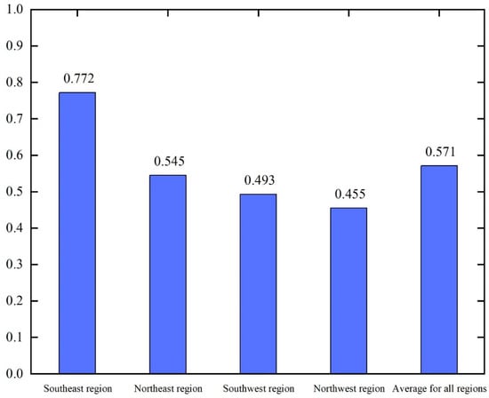 According to Figure 2, the overall average innovation factor allocation efficiency of the provinces along the Belt and Road was 0.571. The overall level of efficiency was not high, probably due to the large disparity in the level of economic development and technological innovation among regions. Regionally, innovation factor allocation efficiency values in the southeast, northeast, southwest, and northwest regions were 0.772, 0.545, 0.493, and 0.455, respectively. The data indicates that innovation factor allocation efficiency was highest in the southeast, followed by the northeast, southwest, and northwest. Innovation factor allocation efficiency decreased from the eastern coastal areas to the western regions of the mainland. Table 3 ranks the provinces along the Belt and Road based on their average innovation factor allocation efficiency from 2012 to 2021.