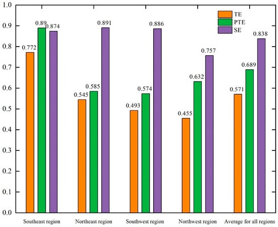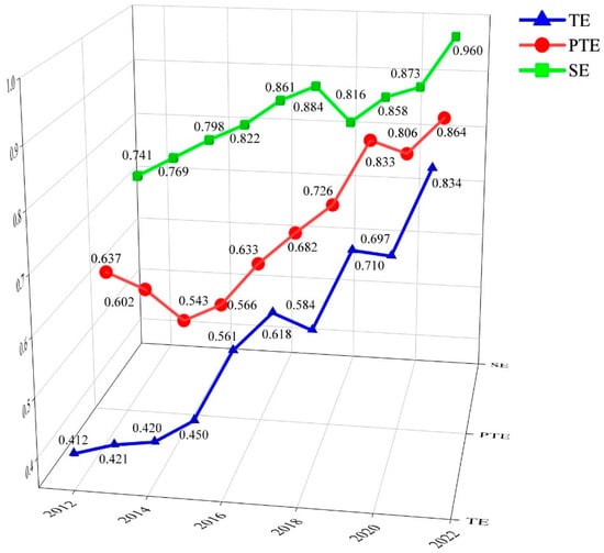 Figure 3 illustrates that from 2012 to 2021, the average values of TE, PTE, and SE in the provinces along the Belt and Road were 0.571, 0.689, and 0.838, respectively. That is, SE > PTE > TE. Overall, the changes in SE and TE tended to be similar, while PTE generally mirrored TE except for a downward trend in 2012–2014.