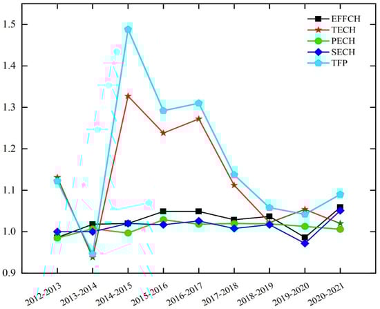 If is greater than 1, then it means that total factor productivity is on an upward trend, otherwise it is on a downward trend, under the definition of VRS, the total factor productivity (TFP) index can be decomposed into comprehensive technical efficiency (EFFCH) and TECH. Therefore, the relationship between the indices is as follows:
