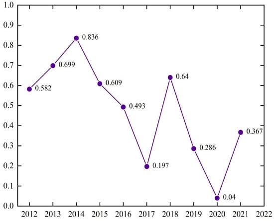 Table 6 illustrates that the Global Moran index values for innovation factor allocation efficiency among provinces along the Belt and Road from 2012 to 2016 all exceeded 0, with Z-values surpassing their respective critical values. Moreover, the p-value was significant at the 1% and 5% levels. This suggests that the allocation efficiency of innovation factors in the regions along the Belt and Road during this period exhibited a pronounced agglomeration characteristic in spatial distribution. The p-value for 2017 was 0.200, failing to meet the significance threshold and indicating spatial uncorrelation. Moreover, during the period 2018–2021, the spatial distribution of regional efficiency along the Belt and Road exhibited considerable instability. Innovation factor allocation efficiency transitioned from spatial correlation in 2018 to spatial non-correlation in 2019–2020. However, it exhibited significant spatial correlation in 2021, with significance at the 5% level. This suggests a declining trend in the spatial distribution agglomeration of innovation factor allocation efficiency along the Belt and Road from 2012 to 2021. Figure 6 illustrates the trend of the Global Moran Index from 2012 to 2021.