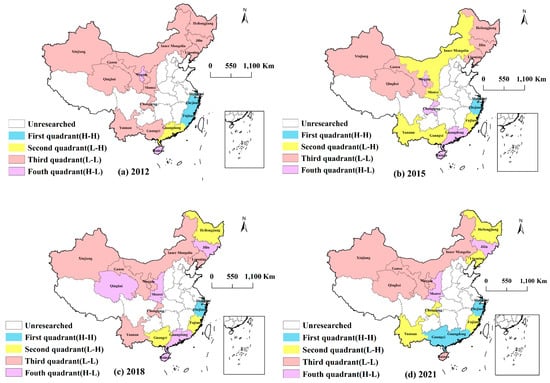 While the global spatial Moran index portrays the overall spatial distribution of innovation factor allocation efficiency across the 17 provinces and cities along the Belt and Road in China, it fails to capture the local spatial distribution relations within the region. Hence, this study investigates the spatial agglomeration of innovation factor allocation efficiency within local areas. In this study, the Local Moran index of innovation factor allocation efficiency was computed for the years 2012, 2015, 2018, and 2021 using Equation (13). The calculation results allowed for the categorization of the local concentration of innovation factor allocation efficiency into four quadrants. The first quadrant corresponds to the H-H type, signifying high innovation factor allocation efficiency within the region as well as in neighboring regions. In the second quadrant, denoted as L-H type, the region exhibits low innovation factor allocation efficiency, while the efficiency in the surrounding region is high. The third quadrant, identified as L-L, signifies low-efficiency values in both the region itself and its surroundings. Finally, the fourth quadrant, labeled H-L, indicates higher innovation factor allocation efficiency within the region compared to its neighboring regions. The results of the quadrantal distribution are shown in Figure 7.
