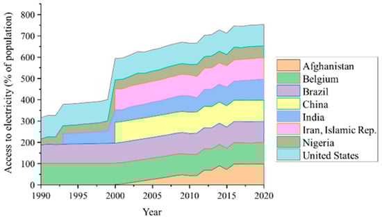 Digital technologies play a key role in enhancing the monitoring, control, and optimization of energy systems, leading to increased efficiency and reliability. Gatto and Drago (2020) [15], for example, delve into the Global Energy Resilience Index (GERI), considering factors such as approved electrification plans with digital technologies, information availability to consumers through digital platforms, incentives for renewable energy, and the integration of carbon pricing and monitoring mechanisms with digital systems. Figure 1 illustrates the percentage of electricity access in certain countries as an indicator within the GERI index based on World Bank data. It emphasizes the practical application of the GERI index, showcasing how it considers real-world data to evaluate and compare the energy resilience of different nations. Moreover, proposals for cross-border trading and innovative energy networks have emerged to bolster regional energy security [25]. In summary, cultivating a comprehensive understanding of energy resilience is essential to confront the challenges posed by the digital economy and ensure a sustainable and resilient energy future.