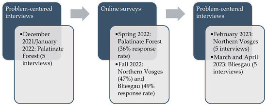 The empirical focus of the present investigation is on the three adjacent biosphere reserves, Palatinate Forest, Northern Vosges, and Bliesgau (Figure 2), and their municipal authorities: The Palatinate Forest (Germany), with an area of around 1800 sq km, emerged from the Palatinate Forest Nature Park founded in 1958 and received the status of a biosphere reserve in 1992. The heavily wooded area (75% of the reserve, largely consisting of beech and pine trees), which also harbors vineyards (almost 6% of the total area) as it passes into the Rhine plain, includes larger centers such as Bad Dürkheim and Neustadt on the Weinstrasse, as well as small rural communities such as Rumbach or Frankenstein. To this day, active forest management, especially by Rhineland-Palatinate State Forests (Landesforsten Rheinland-Pfalz), plays an important role, which brings with it land-use conflicts between protection and use. In addition, there are regular discussions regarding the compatibility or incompatibility with wind turbines in the forest area. In view of other existing conflicts, a major federal highway runs through the Palatinate Forest, whose expansion for faster accessibility is the subject of controversy with reference to animal and noise protection (e.g., for the reintroduction of the lynx), among other things [36] (p. 67), [45] (p. 5), [46] (paragraph 1).