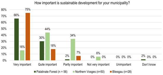 In presenting our results, we combine the quantitative online surveys mentioned above with the qualitative interviews conducted with municipal decision-makers. The quantification serves as a database that is deepened and differentiated with interview excerpts. Thematically, we first examine the importance that local actors in the three biosphere reserves—Palatinate Forest, Northern Vosges, and Bliesgau—attach to the topic of sustainability and, even more basically, how they understand sustainability at all. Building on this, we focus on the extent to which they are already implementing concrete sustainability-related measures and what their guiding principles are in this respect—i.e., to what extent the SDGs are reflected in their work and how they assess their contribution to fulfilling them. At this point, we must also consider whether they perceive any restrictions in the fulfillment of these tasks. Finally, we look at the role of the biosphere reserve offices, which function as a link between global goals and municipal councils [27].