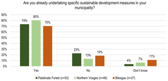 Sustainable development measures undertaken in biosphere reserve municipalities (question in questionnaire: Verfolgen Sie in Ihrer Gemeinde bereits konkrete Maßnahmen im Sinne einer nachhaltigen Entwicklung?/Poursuivez-vous des mesures concrètes dans votre commune dans le cadre du développement durable?) (source: own surveys and diagram 2022).