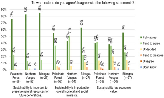 Even if, from a scientific perspective, sustainability should—given the inseparability of its different dimensions [62] (p. 128), [63]—be understood in a more deeply integrative way, we have taken over this broad weighting of issues into our three quantitative surveys, which for pragmatic reasons (good answerability by the respondents) reproduce the “three dimensions of sustainable development: the economic, social and environmental” [17] (p. 1), that play a central role for the United Nations until today (for the evolution of the three dimensions see [64]). Sustainable development is primarily associated by biosphere mayors with the protection and conservation of natural resources: more than three-quarters “fully agree” with this. Its importance for overall societal and social interests is rated slightly lower (55% in the Palatinate Forest and 63% in the Bliesgau fully agree), while its economic relevance is rated lowest of all. The proportion of ‘undecided’ respondents is also highest for this last question (14%/20%/15%), suggesting that sustainability and economic development are not immediately seen as compatible (see Figure 6).
