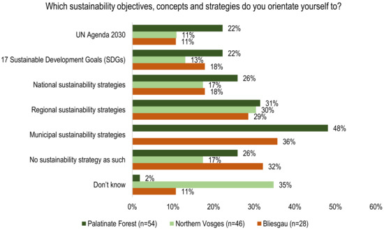 The quantitative surveys show that 17% (Northern Vosges), 26% (Palatinate Forest), and 32% (Bliesgau) of municipal decision-makers claim not to be guided by specific SDGs or associated concepts or strategies. This proportion is certainly worth noting, as it means that sustainability activities in these municipalities are not necessarily aligned with specific overarching guidelines. Survey responses (Palatinate Forest 48%, Bliesgau 36%) indicate that strategic orientation is instead provided by municipal mission statements and sustainability strategies—but these may, in turn, incorporate SDGs (Figure 7). On the French side, the small size of many municipalities means that no corresponding strategies are available at the municipal level, so no Franco-German comparison is possible here. In all three reserves, sustainability strategies at the state or regional level are considered of great importance (Rhineland-Palatinate 31%, Saarland 29%, Grand Est region 30%). In second place come the 17 SDGs and, more generally, the United Nations 2030 Agenda, which less than a quarter of mayors cite as an important guideline (Figure 7). Active alignment with SDGs for the fulfillment of the Lima Action Plan is thus rather thin on the ground, but this does not mean that municipalities do not nevertheless—without classifying their activities as such—do justice to the Lima goals in order to position and further establish the biosphere reserves as model regions for sustainable development.