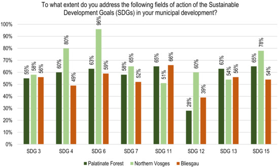 This raises the question of the extent to which biosphere municipalities do actually contribute, however unconsciously, to the fulfillment of SDGs. Participants in the quantitative surveys were asked to assess this for their respective areas. As expected, not all SDGs were considered of equal relevance [68] (p. 321): poverty reduction (SDG 1), for example, was only indicated by 4% of respondents (Palatinate Forest and Bliesgau) or 7% (Northern Vosges) as being intensely addressed—a predictable enough result for France and Germany. Similarly, the elimination of inequality within or between states (SDG 10) was only rated as intensely addressed by 7% (Northern Vosges and Bliesgau) and 9% (Palatinate Forest). On the other hand, there were striking overlaps in the fields of action regarded as most intensely addressed (Figure 8): SDG 6 (Clean water and sanitation) and SDG 15 (Life on land) were among the top 5 in all three reserves. Apart from these two, the five most frequently mentioned SDGs included numbers 3 (Good health and well-being), 4 (Quality education), 7 (Affordable and clean energy), 11 (Sustainable cities and communities), 12 (Responsible consumption and production) and 13 (Climate action). Goals 4, 6, and 15, i.e., education, water, and sustainable land management, stood out in the Northern Vosges, where more than three-quarters of survey participants named them as fields of action; in the Palatinate Forest and Bliesgau, the figure for these goals was about half the total participants; only with SDG 12 (Responsible consumption and production) did this mark drop to around a third.
