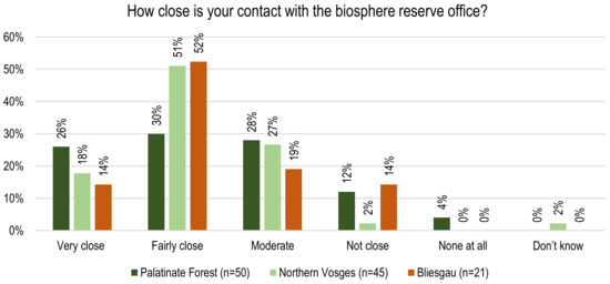 For UNESCO, active cooperation with the biosphere reserve offices is crucial for municipal implementation of the SDGs [7] (p. 7), [37] (p. 7), [69] (p. 43). However, our quantitative surveys paint an ambivalent picture of the connections between local decision-makers and reserves (Figure 9). Thus in the Palatinate Forest only a quarter of all mayors—in the Bliesgau and Northern Vosges even fewer—see ‘very close’ points of contact; for between a third (Palatinate Forest) and half (Northern Vosges and Bliesgau) contact is only ‘fairly close’; for around a quarter (Palatinate Forest and Northern Vosges) and slightly less than a fifth (Bliesgau) of respondents it is only ‘moderate’; and for some Palatinate Forest (12%) and Bliesgau (14%) respondents contact is ‘not close’ at all. One may conclude that in all three reserves, around a quarter of local decision-makers are unaware of the objectives pursued by the biosphere reserves. At the same time, 55% of respondents in the Palatinate Forest and Northern Vosges, and as many as 68% in the Bliesgau, ‘agree very strongly’ or ‘tend to agree’ with the statement that the reserves support municipal sustainability work as model regions for sustainable development; hardly any disagree.
