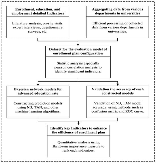 There are two major challenges: the first challenge includes data collection, integration, and analysis mechanisms, and the second challenge comprises the evaluation of sustainable enrollment plan configurations based on student and education quality. Currently, data related to these challenges are housed in different departments of universities, sourced from various databases, and exhibit significant heterogeneity, making integration challenging. Furthermore, without establishing a comprehensive indicator system, researchers either face the challenge of dealing with high-dimensional data with numerous noisy indicators or struggle to extract key information due to the limited number of selected indicators. Moreover, the task becomes more challenging as most machine learning or deep learning algorithms, while capable of producing satisfactory predictive results, often fall short in establishing dynamic adjustment mechanisms for enrollment plans. For example, despite researchers attempting to utilize Bayesian classification algorithms and incorporating them into decision tree learning models to construct predictions, they have not recognized the unique node relationships of Bayesian networks for studying the states of indicator combinations. Bayesian networks provide a powerful tool for analyzing and optimizing complex relationships. Therefore, it is possible to explore this technology, establish a network structure with the advanced education rate as the target variable, and discover key influencing features under different indicator combinations, subsequently identifying the optimal combination strategy.