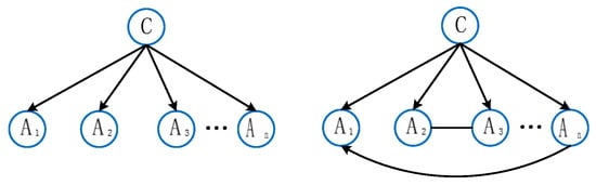 The naïve Bayes (NB) classifier is a popular algorithm in Bayesian networks, often used in document classification and spam filtering. It assumes independence among modeling random variables, with each variable related only to one parent node, typically the target prediction variable. The tree-augmented naïve Bayes (TAN) classifier enhances this method by introducing a tree structure to capture dependencies among features, thus relaxing the assumption of attribute independence. Therefore, when dealing with classification problems, especially in cases where correlations exist among features, the TAN classifier method can provide more accurate probability estimates [,]. One should suppose that represent n attribute variables, and C represents the target variable. Examples of NB and TAN are illustrated separately in Figure 4.