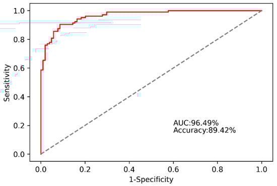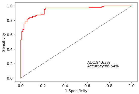 Next, we plotted the ROC curve of the model, as shown in Figure 7, and calculated the AUC value, as well as the overall Acc. Finally, we obtained an area under the ROC curve of 94.63%.