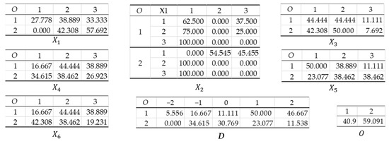 Based on the evaluation model, it is possible to lock the initial state by considering different combinations of states of included indicators and then changing another state to observe the probability distribution of the advanced education rate. To quantitatively analyze the importance of each influencing factor, the Bayesian predictive model can be combined with importance theory. By altering the type of state for a specific predictive indicator, the difference in prediction rate can be obtained. Additionally, in many cases, a feature’s state is not binary but may be divided into low, medium, and high categories. Based on the composite importance measures method for polymorphic systems, the Birnbaum importance of each predictive indicator can be defined as follows []: