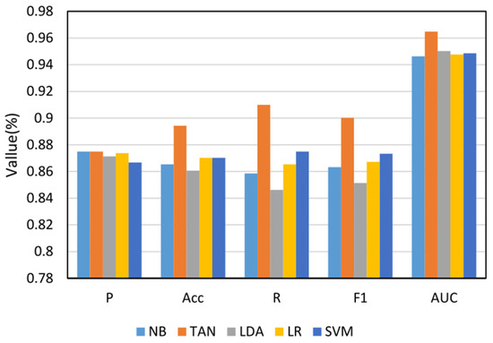 Combining the model evaluation table and the performance comparison chart, we can observe that there was no significant difference between the precision of several models. However, the recall rate of the TAN algorithm is much higher than that of the other three algorithms, reaching 0.91. Since the F1 is closely related to P and R, the F1 is also highest for the TAN algorithm, followed by that of the SVM, LR, and NB algorithms. In terms of Acc and AUC value, the TAN algorithm still performs the best. Taking into account all indicators, the TAN algorithm performs the best in P, Acc, R, F1, and AUC value. The NB, LR, and SVM algorithms have relatively mediocre performance, while LDA performs poorly and is not suitable for this type of data research. Therefore, compared with three machine learning algorithms, namely, LDA, LR, and SVM, the TAN classifier demonstrates certain advantages in prediction, as confirmed by the comprehensive consideration of various performance indicators from different perspectives.