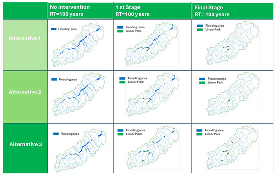 Flood areas in the Jaguaré stream basin in the 3 described alternatives. Source: [42]. Adapted by the authors.